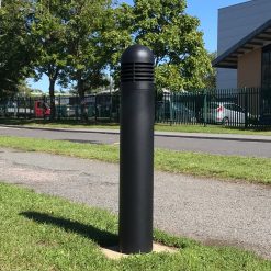 This commercial root mount bollard light (in ground), has a sturdy Fortress head. The Professional ‘In-Ground’ Root Mount System is for extra security. Replacing the standard body and mounting base, the root mount bollards have longer tubes. At least 400mm secures / concretes in place without losing any height above ground. A mounting bar inside the tubular body also anchors the bollard when set into concrete. An optional secure cable outlet allows easy wiring after the bollard fixes in place.