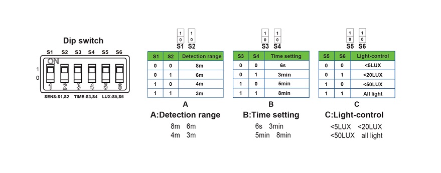 With the in-built PIR sensor included, there is no need to remember to switch the fitting on and off manually each night. This means less product maintenance. The E27 / ES bulb holder accommodates almost any 240V LED bulb. Using LEDs is a very effective way to reduce energy bills. Select your required settings with the adjustable PIR: