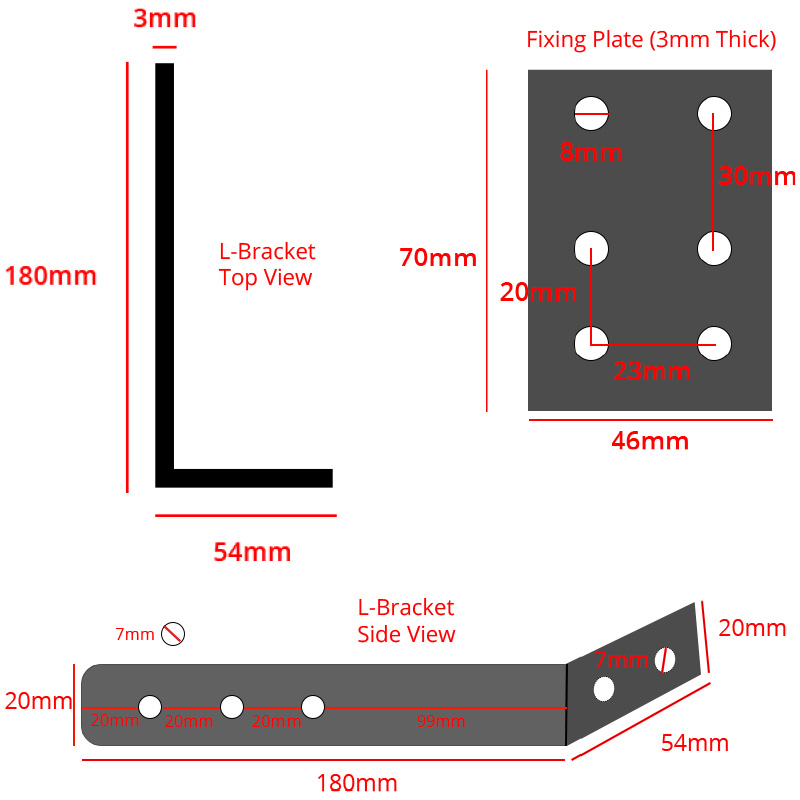 The sturdy, 3mm thick, multiway mounting brackets allow various mounting options. Two separate 180mm L shaped mounting arms attach to the luminaire via M5 stainless steel socket screws, and in turn to the front of the mounting surface. Additional mounting plates are also provided. They act as a riser for clearing graphics and allowing mounting from behind a sign, so as not to interfere with frontal graphics. Alternatively, use as an additional mounting support.