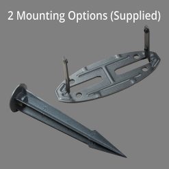 Multiple mounting options come with this PIR Solar Path Light. The removeable, internal mount secures directly onto any flat surface. It also mounts onto concrete with the supplied anchor bolts. In addition, two substantial aluminium 4 fin ground spikes allow mounting into soft ground. These ground spikes simply attach to the internal surface mount.
